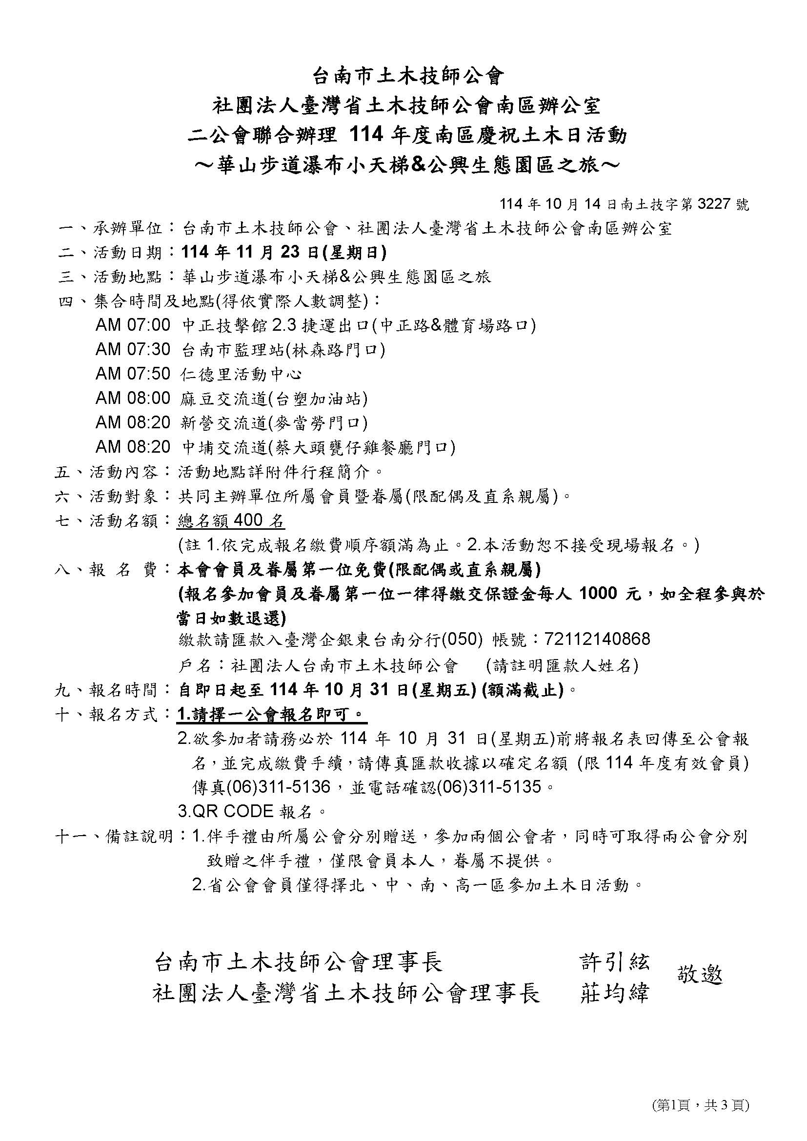 最新消息 台南市土木技師公會、社團法人臺灣省土木技師公會南區辦公室 二公會聯合辦理 『114年度南區慶祝土木日活動 ~華山步道瀑布小天梯&公興生態園區之旅~』 2025-10-17 相關附件 (114)南3227(南市)土木日-報名表.pdf 上一則 下一則