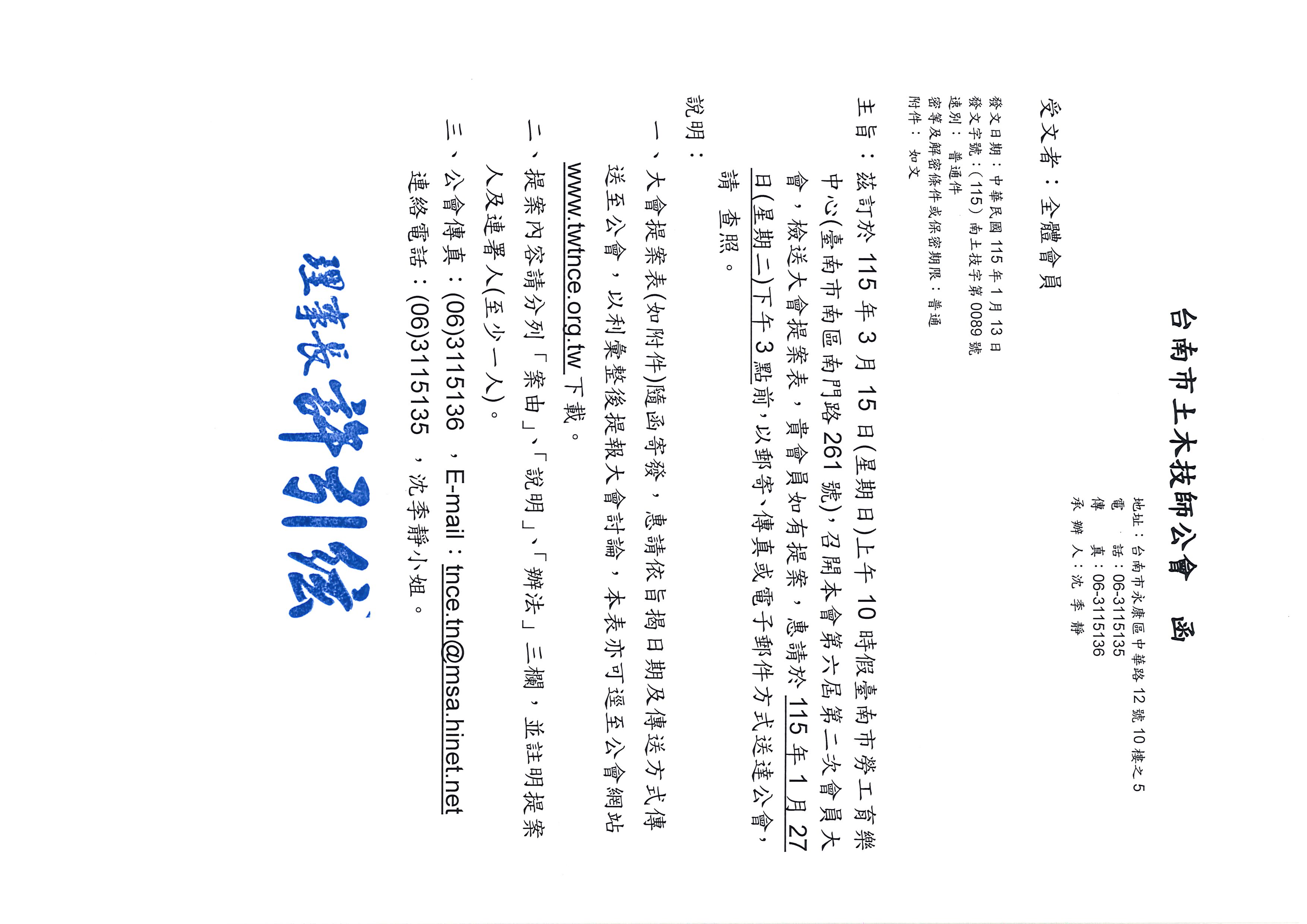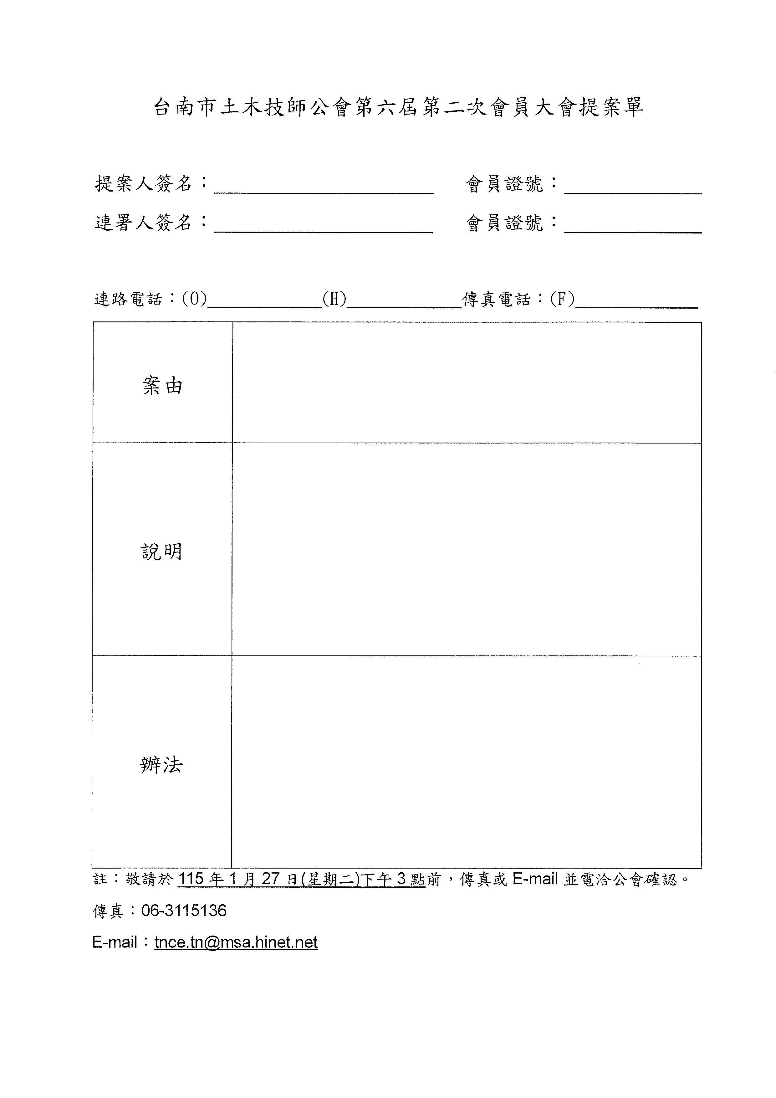 最新消息 【公告】召開本會第六屆第二次會員大會暨受理會員提案事宜。(提案截止至115年1月27日(星期二)下午3時前) 2026-01-16 相關附件 (115)南0089(全體會員)檢送大會提案單.pdf 上一則 下一則